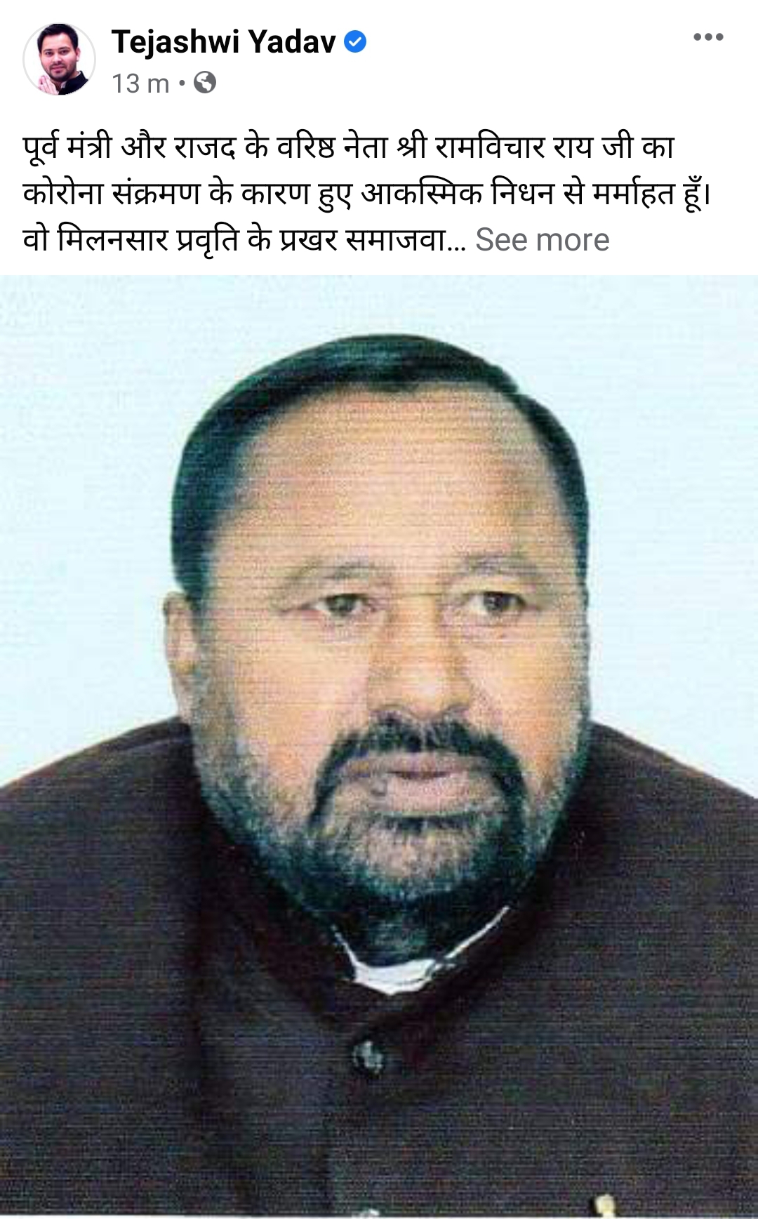 मुजफ्फरपुर जिले के पूर्व मंत्री और राजद नेता रामविचार राय की करोना से हुई मौत तेजस्वी यादव ने जताया शोक