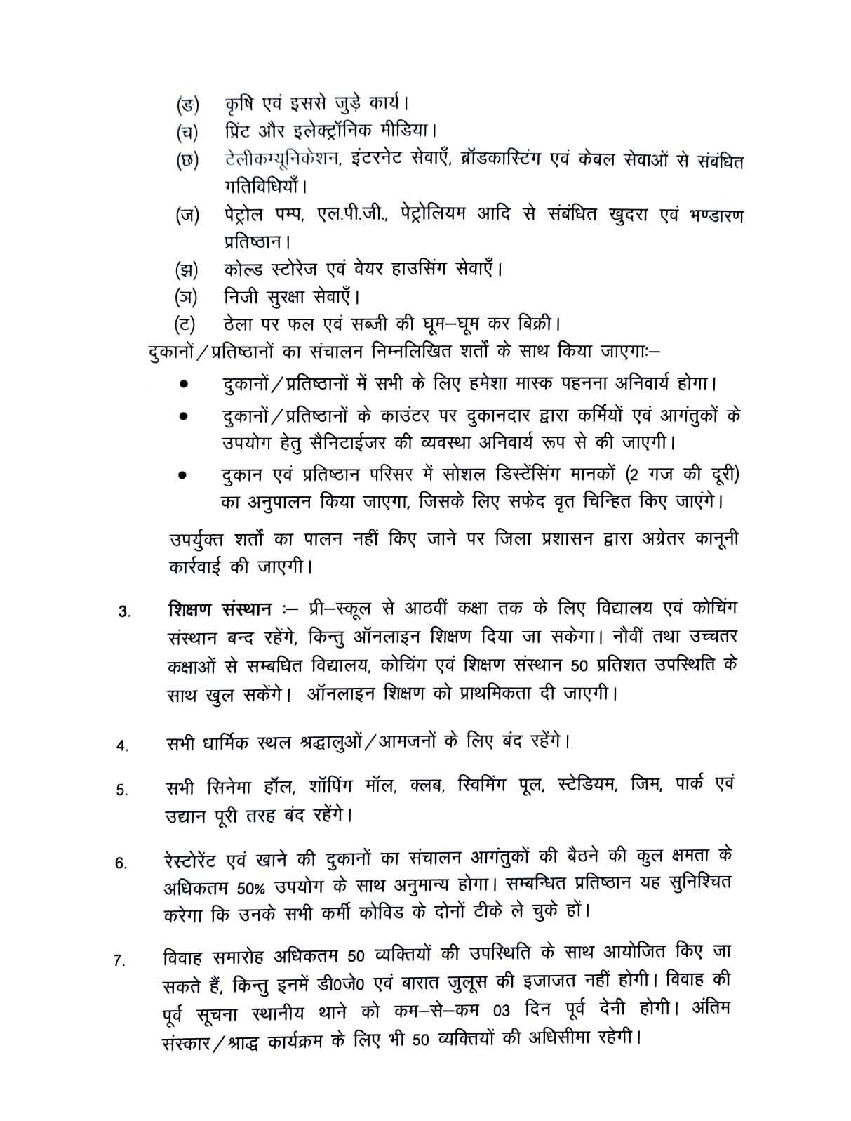 - सभी सरकारी कार्यालय और गैर-सरकारी कार्यालय 50% उपस्थिति के साथ खुले रहेंगे। सरकारी कार्यालयों में आगंतुकों का प्रवेश वर्जित होगा।