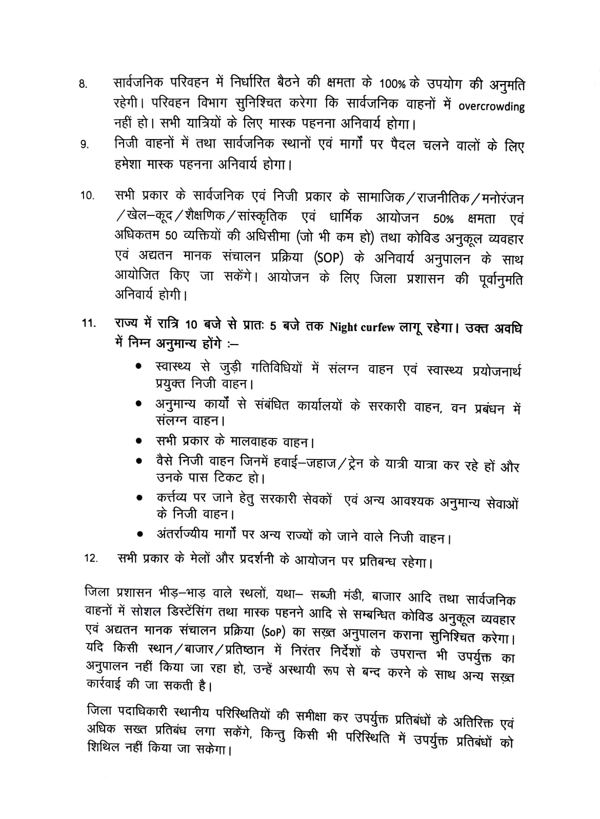 - सार्वजनिक परिवहन में निर्धारित बैठने की क्षमता के 100% के उपयोग की अनुमति रहेगी। परिवहन विभाग सुनिश्चित करेगा कि सार्वजनिक वाहनों में ओवर क्राउडिंग नहीं हो। सभी यात्रियों के लिए मास्क पहनना अनिवार्य होगा।