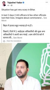 तेजस्वी यादव ने बिहार सरकार की तैयारियों पर सवाल उठाते हुए कहा कि “मैंने वेंटिलेटर और ऑक्सीजन स्टॉक की संख्या बढ़ाने के लिए बिहार के सीएम से बार-बार अनुरोध किया, लेकिन सब कुछ बहरे कानों में पड़ गया. समस्या को ठीक करने के बजाय, उन्होंने हेडलाइंस, ईमानदार अधिकारियों को तय किया और संख्याओं को निर्धारित किया. परिणामस्वरूप राज्य को फिर से ठीक करने के लिए उन्होंने एक साल बर्बाद कर दिया.”