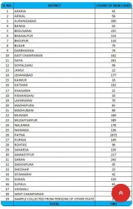 इसके अलावा भोजपुर में 110, बक्सर में 79, पूर्वी चंपारण में 162, गया में 261, गोपालगंज में 98, जमुई में 12, जहानाबाद में 177, लखीसराय में 70, मधेपुरा में 65, मधुबनी में 88, मुंगेर में 349, मुजफ्फरपुर 389, नालंदा में 178, नवादा में 136, पूर्णिया में 149, रोहतास में 96, सहरसा में 159, समस्तीपुर में 217, सारण में 243, शेखपुरा में 45, सीवान में 159, वैशाली में 96 और पश्चिम चंपारण में 176 नए मामले सामने आये हैं.
