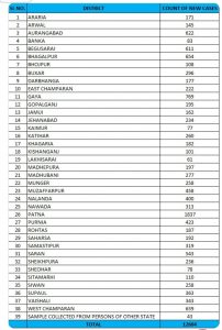 साथ ही जहानाबाद में 234, कैमूर में 77, कटिहार में 260, खगड़िया में 182, किशनगंज में 101, लखीसराय में 61, मधेपुरा में 197, मधुबनी में 277, मुंगेर में 258, मुजफ्फरपुर 458, नालंदा में 400, नवादा में 313, पूर्णिया में 423, रोहतास में 187, सहरसा में 192, समस्तीपुर में 319, सारण में 543, शेखपुरा में 236, शिवहर में 78, सीतामढ़ी में 110, सीवान में 258, सुपौल में 363, वैशाली में 343 और पश्चिम चंपारण में 639 नए मरीजों की पहचान की गई. बाकि दूसरे राज्य के रहने वाले 43 लोगों की भी रिपोर्ट पॉजिटिव आ है, जो बिहार में हैं